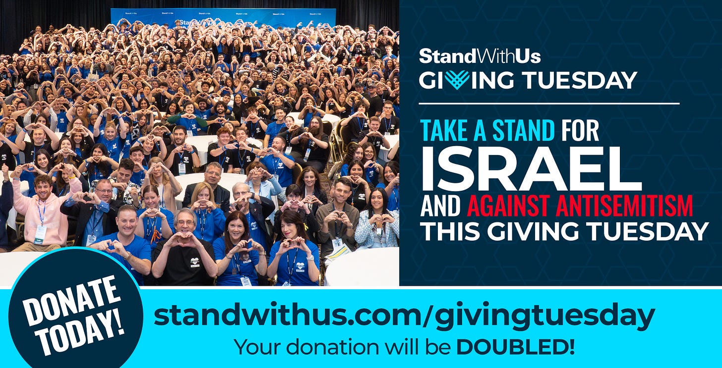 Oh, and one more thing: I’m writing this on Giving Tuesday, the international day of unity and giving and so if you appreciate the work of StandWithUs, fighting antisemitism and supporting Israel around the world, then please take a moment to donate to keep that work strong. Thanks to generous supporters, every donation you make today will be matched and doubled. Thank you for standing with us!